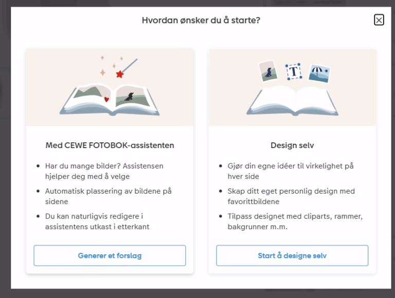 På CeWe velger du format og utseende på fotoboken og trykker på «Design her», deretter får du to valg, enten la systemet lage boken for deg, eller gjøre alt manuelt.