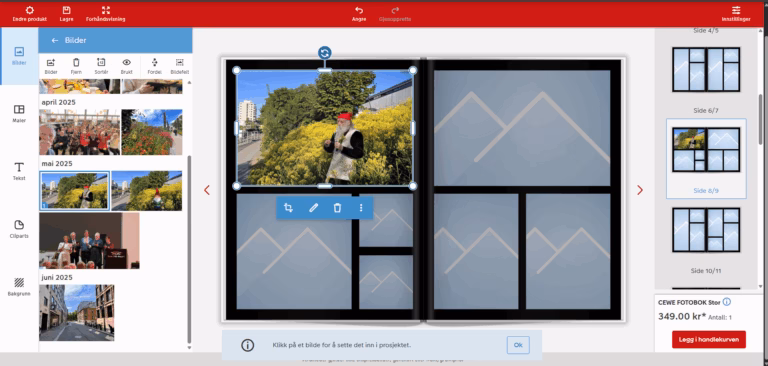 Når du er fornøyd med alle bildene dine, trykk på rød knapp nederst til høyre, Legg i handlekurv, gå dit og betal og fotoboken kommer i posten om noen dager.