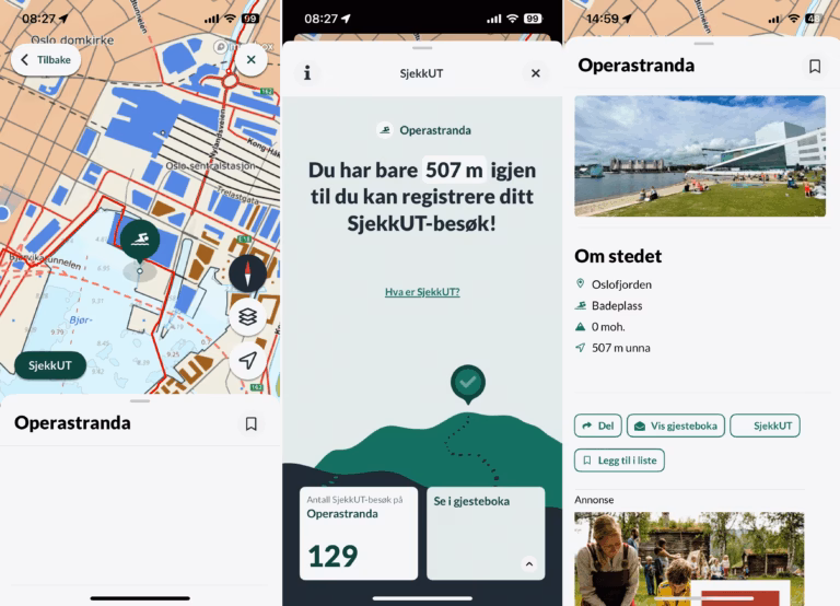 Når du er i nærheten av et sted du kan sjekke ut, kan du trykke på sjekkUT-knappen. Du må først trykke på den grønne knappen på stedet for å få frem sjekkUt-knappen. I eksempelet under ser du at vi er litt for langt unna stedet du kan sjekke ut. Du ser avstanden og hvis du stenger den siden kan du dra opp informasjon om stedet du vil sjekke ut også. I vårt eksempel er det Operastranda.